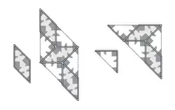 - Su no periodicidad está implícita en su estructura jerárquica: los teselados son teselados de sustitución que surgen de reglas de sustitución para bloques cada vez más grandes. Esta estructura de sustitución también implica que: