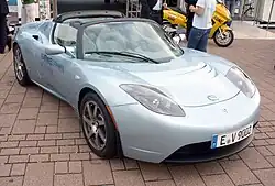 El primer coche de la compañía fue el Tesla Roadster, primero de serie que usando baterías de iones de litio obtiene una autonomía de más de 200 millas (322 km) por carga.[49]​ El modelo base acelera de 0 a 60 millas por hora (97 km/h) en 3,9 segundos y según el análisis medioambiental de Tesla Motors es el doble de eficiente que el Toyota Prius.[50]​ El precio final del modelo básico de 2009 era de US$109 000 (93 478 euros según la cotización de hoy). Hasta junio de 2012 se habían vendido 2100 unidades en 31 países y habían recorrido más de 37 millones de kilómetros eléctricos.[51]​ Este vehículo apareció en la portada de Time en diciembre de 2006 como "premio a la mejor invención de transporte de 2006".[52]​ Tesla dejó de admitir pedidos para el Roadster en agosto de 2011.[53]​ Usa un motor de corriente alterna AC que deriva directamente del diseño original de Tesla en 1882.[54]