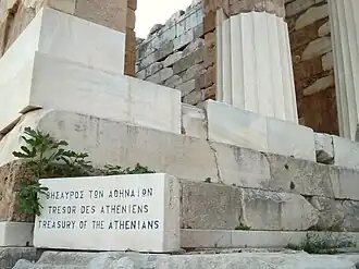 - ↑ a b c d «Θησαυρός των Αθηναίων» [Treasury of the Athenians] (en inglés). Υπουργείο Πολιτισμού και Αθλητισμού. Consultado el 23 de agosto de 2024.