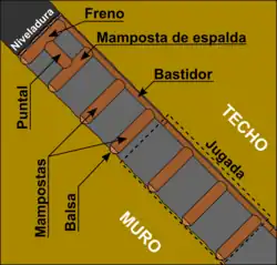 El sostenimiento inmediato del hueco producido por el deshulle de la capa se realiza mediante piezas de madera, fundamentalmente pino y eucalipto. Principalmente la entibación se realiza con mampostas,[a] piezas cilíndricas que se colocan perpendicularmente a los estratos. La parte superior de la mamposta se apoya sobre una pieza de madera que se denomina bastidor. Este es una pieza de madera de eucalipto, de forma semicilindríca, de 2,5 m de longitud, mayoritariamente. La parte plana del bastidor se apoya sobre el muro (estrato inmediatamente superior de la capa de carbón) mientras que la parte cilíndrica es la que está en contacto con la mamposta. Para ello, la cabeza de la mamposta ha de ser labrada con la forma del bastidor, en una talla que se conoce como boca de lobo. Cada bastidor está contacto con tres mampostas alineadas y paralelas al testero, en un conjunto básico que se denomina jugada. Además cada bastidor se apoya en el bastidor de la jugada inferior, en la disposición que se conocen como "encadenar jugadas". El espacio comprendido entre dos hileras consecutivas de jugadas se denomina calle y tiene una anchura en torno a 1 m.