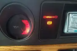 Muchos vehículos poseen un testigo de color rojo para indicar que el freno de estacionamiento está activado o que hay un fallo en el sistema de frenado.[9] En la mayoría de los casos lleva los símbolos ISO del freno de estacionamiento y el de una emergencia del sistema de frenos. En el pasado, las regulaciones de los Estados Unidos exigían que este indicador llevara la leyenda brake.[12]