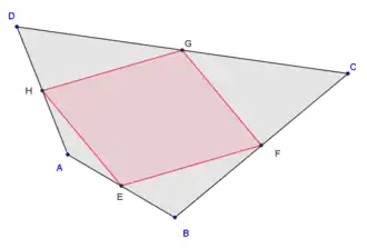 • Los cuatro triángulos más pequeños formados por las diagonales y los lados de un cuadrilátero convexo tienen la propiedad de que el producto de las áreas de dos triángulos opuestos es igual al producto de las áreas de los otros dos triángulos.[50]