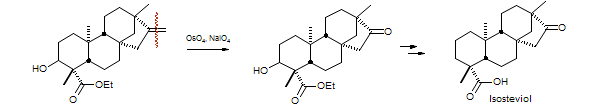 En combinación con peryodato de sodio, el OsO4 es usado para la ruptura oxidativa de alquenos (oxidación de Lemieux-Johnson) cuando el peryodato sirve tanto para romper el diol formado por dihidroxilación y para reoxidar el OsO3 de vuelta a OsO4. La transformación neta es idéntica a la producida por ozonólisis. Debajo, un ejemplo de tomado de la síntesis total de Isosteviol.[17]