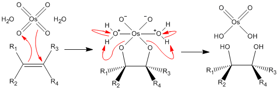 En términos de mecanismo, el OsVIIIO4 se adiciona a los alquenos R2C=CR2 para formar "ésteres" cíclicos R4C2O2OsVIO2, que se someten a hidrólisis para dar el diol vecinal y liberar un óxido de osmio reducido (OsVI):