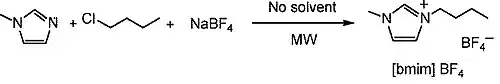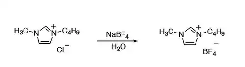 Una forma sencilla y la más utilizada es haciendo reaccionar cloruro de 1-butil-3-metilimidazolio con NaBF4 en disolución acuosa.[4]