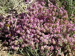 Es un Sufrútice de 5-25 cm de alto, cespitoso/postrado, ramificado, ocasionalmente con rizomas o estolones, aromático y, a veces, con dimorfismo estacional. Los tallos son gruesos, con entrenudos cortos, marcados, foliosos, algodonoso-tomentosos, con pelos ramificados muy largos, de ramas largas y entrelazadas; los tallos invernal-primaverales son ascendentes, a veces postrados y con rizomas o estolones, blancos, rara vez amarillentos; los primaveral-estivales erectos, blanquecinos, verdes, grisáceos o amarillos; los floríferos erectos, pubescentes, rojizos. Las hojas de 4-14 por 1-4 mm, son triangular-oblongas, oblongo-lanceoladas u oblongo-lineares, cuneadas o subcordiformes, dentadas, crenadas o lobuladas desde el tercio inferior o la mitad, con lóbulos oblongos, fasciculadas; también son revolutas, algodonoso-tomentosas, con dimorfismo estacional, las invernales grisáceas, las primaverales verdes o amarillentas. La inflorescencia de 1,3 por 2 cm, en cabezuela terminal, es formada por cabezuelas 1-1,5 por 1 cm, con 2-10 flores, esféricas o espiciformes, subsésiles o con pedúnculos de 1-1,5 cm, finos, erecto-patentes, pubescentes, foliosos, con 2 o 3 verticilos de hojas. Las brácteas son oblongas, cuneadas, crenadas o lobuladas desde el tercio superior, más largas que la inflorescencia; bractéolas superiores ovado-lanceoladas, planas, crenadas en el ápice. El cáliz, de 4,5-6 mm, es tubular, giboso, irregular, voluminoso debido al indumento denso, algodonoso-tomentoso, por dentro con pelos glandulares y otros largos, ondulados; dientes planos, triangulares, los superiores de cerca de 1 mm, triangular-obtusos, los inferiores de 1,5 mm, agudos. La corola mide 8-8,5 mm y es unilabiada, color crema, rosado o púrpura, con tubo de 4 mm, garganta de casi 2 mm; los lóbulos latero-posteriores son agudos, ciliados, y los lóbulos laterales, de 1,5 por 1 mm, son oblongos y agudos; el lóbulo central tiene 2,5-1,5 mm y es espatulado. Los frutos, en núculas, tienen 1,5 por 2,5 mm; son ovoides, reticulados, color castaño o negro. El número de cromosomas es: 2n = 26.[2]