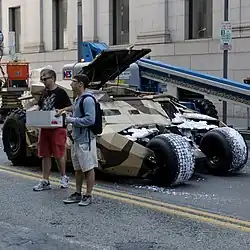 Las fotos de la producción del rodaje en Pittsburgh mostraban un segundo chasis del Acróbata, indicando que habría un nuevo Batimóvil en la película después de la destrucción del primero en The Dark Knight.[121] Más fotos del set revelaron un «nuevo vehículo» transportado al túnel Wabash, lo que provocó especulaciones en cuanto a su naturaleza.[122] En junio de 2011, Autoblog confirmó la presencia del nuevo Lamborghini en el set de filmación.[123]