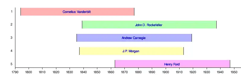 | 8 | El Automóvil | - | Un joven ingeniero llamado Henry Ford está trabajando en un invento: un auto a gasolina accesible para la clase media. Consigue un patrocinio y desarrolla la novedosa línea de ensamblaje. McKinley es asesinado y su Vicepresidente Theodore Roosevelt toma el mando del país. Comienzan a aparecer una nueva serie de regulaciones que incrementan la vigilancia sobre los negocios. J.P. Morgan es llevado a juicio y su monopolio ferroviario es dividido, siendo el primer monopolio en ser dividido a manos del gobierno. Rockefeller también es llevado a juicio por delitos con el fisco, y provoca la división de su compañía, la Standard Oil. J.P. Morgan, ayuda a establecer la Reserva Federal y se convierte en el padre del capitalismo moderno. Carnegie en sus últimos años regala gran parte de su fortuna. Este antecedente de caridad, sería seguido en el futuro por empresarios exitosos como Bill Gates. La serie termina con la partida del ejército norteamericano hacia una guerra en Europa, dejando en claro que, aunque los Gigantes de la Industria no descubrieron el país, sí lo construyeron. |