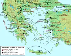 El término «Hellas» se usaba desde el siglo VI para designar al sur de Grecia en un contexto administrativo, siendo empleado en el Synekdemos como un nombre alternativo para la provincia romana de Acaya.[1][2]​ A finales del siglo VI y principios del VII, el derrumbe de la frontera en el Danubio significó la invasión y población por eslavos de la península balcánica. Desde 578, las incursiones eslavas llegaban a Tesalia y el sur de Grecia. Sumadas a las largas y sangrientas guerras con Persia en el este y con los ávaros al norte, los eslavos no encontraron casi oposición. Para finales del siglo VI y principios del VII, afectaban más al Peloponeso en el sur y Macedonia en el norte que a Tesalia o Grecia Central, que se encontraban más fortificadas y en manos de la población griega nativa.[3]​ No obstante, en las primeras décadas del siglo VII los eslavos saquearon Tesalia sin muchas consecuencias, en c.615 las tribus eslavas incluso empleaban monoxyla para lanzar campañas marítimas en las costas de islas, despoblando muchos lugares. Algunos griegos nativos huyeron a ciudades, islas más inaccesibles o a Italia.[4]