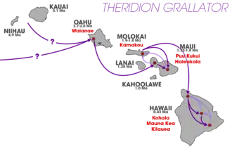 - ↑ Croucher, Peter; Oxford, Geoff; Lam, Athena; Gillespie, Rosemary (2012). «"Colonization History and Population Genetics of the Color-Polymorphic Hawaiian Happy-Face Spider Theridion Grallator (Araneae, Theridiidae)".». Evolution. PMID 22946805. doi:10.1111/j.1558-5646.2012.01653.x.