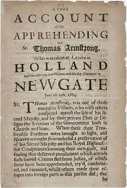 - ↑ Drabble, James. «Two Perspectives on the Execution of Sir Thomas Armstrong (1684): Tory Triumphalism and Dutch Distaste». University of Oxford. Consultado el 31 de marzo de 2023.
