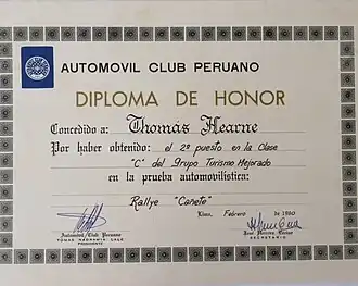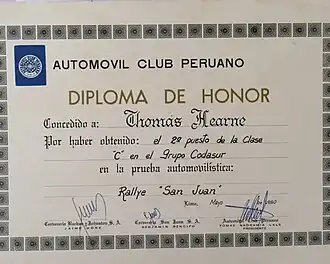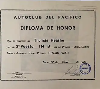 Aquí cabe destacar que Thomas Hearne ganó una de la más importantes carreras de mayor trascendencia en Perú y es "Caminos del Inca" en los años 1969, 1978, 1980 y 1981. En esta carrera se pone a prueba la destreza de los pilotos y la resistencia de los autos.