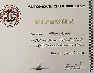 2do puesto en "Rallye Asociación Automotriz del Perú", 1986.