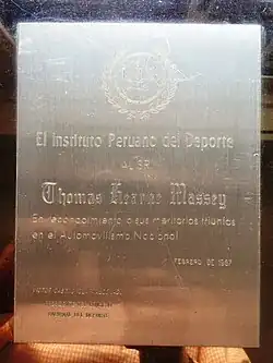 Trofeo de plata de la carrera "Marginal de la Selva" que ganó Thomas Hearne, entregado y firmado por el presidente de la República Arq. Fernando Belaúnde Terry.