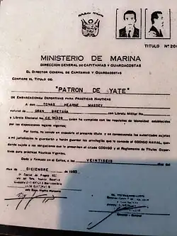 Certificado de "Patrón de Yate" otorgado por el Ministerio de Marina de la República del Perú.