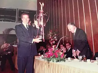 Esta foto corresponde a la premiación hecha por el presidente de la República del Perú Arq. Fernando Belaúnde Terry a Thomas Hearne.