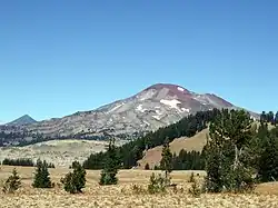 ![]() Vista desde el sureste de los Three Sisters, tres volcanes escasamente cubiertos de hielo y nieve (de izda. a dcha, South, Middle y North Sister, con una lengua de lava negra a la izquierda) | ||