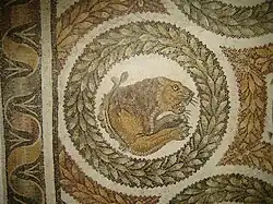 El mosaico que se denomina Teseo y el Minotauro se puede datar a finales del siglo III. En este mosaico se representa la batalla final donde Teseo se dispone a cortar la cabeza al Minotauro.[31] Este mosaico se complementa con escenas de monstruos marinos y naturaleza muerta.[32] También en varios mosaicos podemos encontrar escenas de vida cotidiana, como escenas de caza a caballo con perros.[33]
