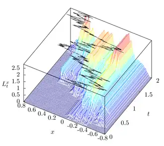 donde b(s) es el proceso de difusión y δ es la delta de Dirac. Es un concepto inventado por Paul Pierre Lévy. La idea básica es que ℓ(t, x) es una medición (reajustada) de cuánto tiempo ha pasado b(s) en x hasta el tiempo t. Lo cual puede expresarse como sigue:
