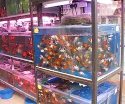 Tiendas de mascotas, especialmente los especializados en animales acuáticos venden productos como peces, comida para peces, filtros de acuario, filtros de fondo, coral, y roca viva.