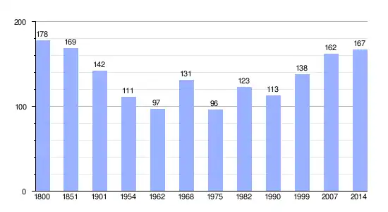 Los datos demográficos contemplados en este gráfico de la comuna de Tierceville[4] se han cogido de 1800 a 1999 de la página francesa EHESS/Cassini, y los demás datos de la página del INSEE.[5]