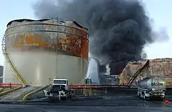 Durante el apogeo del tifón en la isla Cabras en Guam, el 20 de diciembre de 2002, un tanque de gasolina se incendió, se cree que se debe a la fricción causada por vientos extremadamente fuertes que atraviesan su sistema de ventilación. El tanque explotó, enviando su tapa por el aire y extendiendo el fuego a otros tanques cercanos. La proximidad de los tanques, así como la baja presión del agua, obstaculizaron los esfuerzos de extinción de incendios y el fuego se extinguió cinco días después; resultó en tres tanques de gasolina destruidos y dos más incendiados.[11] Mientras ardía el fuego, se suspendió el transporte de gasolina desde el puerto al resto de Guam, lo que provocó la interrupción de las ventas de gasolina para el público en general.