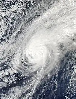 El tifón Pongsona se acerca a la intensidad máxima como un supertifón categoría 4 en la escala de huracanes de Saffir-Simpson (EHSS) el 8 de diciembre de 2002 cerca de Guam e Islas Marianas del Norte de los Estados Unidos | ||
