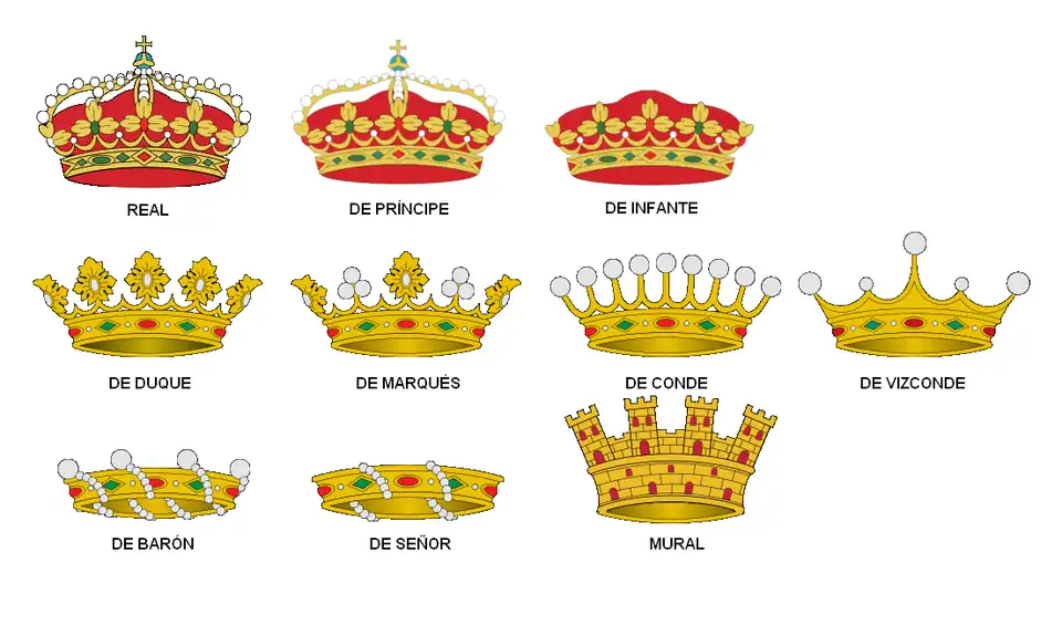 - La corona mural, que es propia de la heráldica cívica y se forma con torreones sobre un cerco a modo de muro.