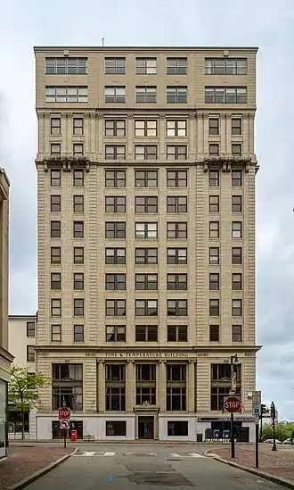 - ↑ a b c d e f g Anderson, J. Craig (12 de mayo de 2016). «Portland’s Time & Temperature Building lands in foreclosure». p. Portland Press Herald. Consultado el 31 de mayo de 2020.