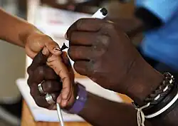 Votante india siendo marcada mediante pintado durante las elecciones a la Asamblea Legislativa de Delhi en 2015. Votante de la República Democrática del Congo introduciendo el dedo pulgar en tinta indeleble tras emitir su voto en las elecciones de 2011. Miembro de mesa marcando a un votante en la segunda vuelta de las elecciones presidenciales de 2011 en Haití.