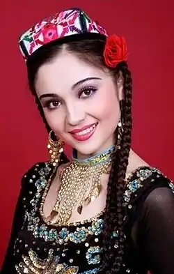 Tocado tradicional de mujeres solteras de Kazajistán, Karakalpakstan y Kirguistán. |