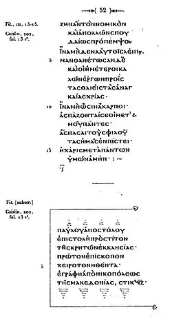 - Codex Coislinianus (c. 550; Versículos 13-15 existentes, con endnotas únicas)