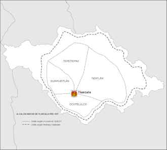 Durante el Período Posclásico mesoamericano existían dos ciudades en el valle central de Mesoamérica que se disputaban la hegemonía del denominado Imperio azteca;[33]​ ellas eran —México-Tenochtitlan— en el valle de México y la capital de la confederación de Tlaxcala, —Tlaxcallan—, en el valle Poblano-Tlaxcalteca. Hacia la segunda década del siglo XVI estas dos ciudades habían establecido un estado de guerra por los constantes conflictos.[34]Tlaxcallan estaba organizada políticamente en cuatro cabeceras (Tepeticpac, Ocotelulco, Quiahuiztlan y Tizatlan) y desde ahí regían a la República de Tlaxcala.[35]