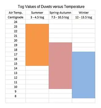 Los edredones británicos se venden en intervalos de 1,5 togs desde 4,5 togs (verano) a 16,5 togs (extra-caliente). Los valores declarados son valores mínimos, los reales puede ser hasta 3 togs más altos. Estos valores togs suponen que no hay funda de edredón añadida que pueda atrapar el aire y que el durmiente está sin ropa; la ropa de dormir (pijamas) y otras capas similares pueden hacer una diferencia significativa para los valores tog más bajos.