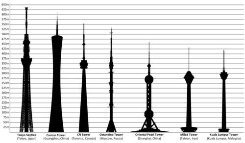 La Tokyo Skytree es la torre más alta del mundo, no considerando así a los edificios, superando a la Torre de televisión de Cantón (600 m, 1969 pies), la estructura más alta en una isla, más alta que el Taipei 101 y la tercera estructura más alta del mundo después del Burj Khalifa, y el Merdeka 118