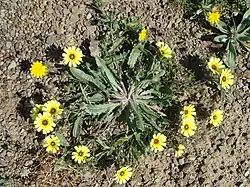 Planta anual, de tamaño muy variable (6-90 cm), vellosa, erecta, con tallo simple o ramificado, en este caso el tallo central se ve rebasado por las ramas laterales. Hojas generalmente basales, lineares-lanceoladas, de márgenes enteros hasta dentados o profundamente divididos, que se hacen más pequeñas cuanto más arriba están. Flores en grupos. Cabezuelas de 1-1,5 cm de ancho, solitarias o en grupos en pedúnculos dilatados. Capítulos amarillos con un centro púrpura rojizo oscuro. Todos los flósculos son lígulas. Involucro de 6-15 mm de alto, con brácteas delgadas, las externas curvadas hacia fuera y las internas rectas. Solo se forman lígulas, amarillas (secas verdes), las internas pardas frecuentemente. Los frutos externos (aquenios) con una corona de pelos cortos (vilano), los internos con pelos cortos y más largos. Florece en primavera.[1]