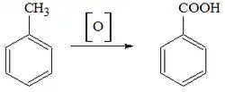 En condiciones normales el tolueno es estable. Con oxidantes fuertes —por ejemplo, una disolución ácida de permanganato potásico (KMnO4)— el grupo metilo es oxidado, pasando por productos intermedios como el alcohol bencílico y el benzaldehído, para dar, finalmente, ácido benzoico. La misma reacción se puede llevar a cabo de forma catalítica con oxígeno como oxidante o mediante óxidos de nitrógeno en fase de vapor.