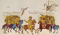 ![]() Miniatura del Madrid Skylitzes de Juan Skylitzes que representa a Tomás, sobre un caballo y vestido como emperador bizantino, negociando con los árabes. La rebelión de Tomás es uno de los episodios más ricamente ilustrados en la crónica.[1] | ||