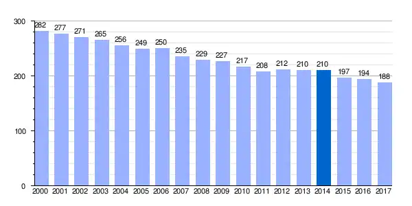 | Gráfica de evolución demográfica de Tombrio de Abajo[1] entre 2000 y 2017 |