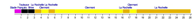 | Stade Rochelais | 7 | 6 | 2 | 1 | 2 | 1 | 2 | 2 | 4 | 2 | 2 | 3 | 4 | 3 | 2 | 2 | 1 | 2 | 1 | 1 | 1 | 1 | 1 | 1 | 1 | 1 |