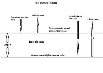 A partir de los datos obtenidos por el SHARAD, se pudo determinar la “permitividad dieléctrica”, o la constante dieléctrica, calculándose la cantidad de penetración del radar por su reflejo en el fondo de la capa rica en hielo. La profundidad del reflejo se estableció examinando fotografías de alta resolución de las distintas ubicaciones, dado que ciertos lugares presentan huecos o ventanas en la capa rica en hielo, donde los mapas topográficos tomados por el MOLA permiten medir directamente su profundidad. La parte superior de la capa rica en hielo mostró polígonos, depresiones festoneadas, y cráteres desenterrados, todos ellos considerados indicadores de la presencia de hielo.[21]