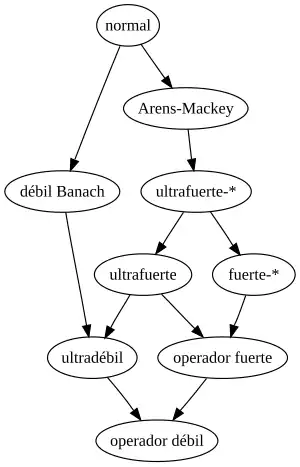 - La topología σ-fuerte-* o topología ultrafuerte-* es la topología más débil y más fuerte que la topología ultrafuerte, de modo que el mapa adjunto es continuo. Está definido por la familia de seminormas pw(x) y pw(x*) para elementos positivos w de B(H)*. Es más fuerte que todas las topologías siguientes.