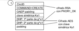 Sobre el formato de la célula CREATE cabe señalar que el cifrado de g^x se hace de forma híbrida (con RSA-OAEP se cifra una clave de sesión y parte de g^x, con la clave de sesión se cifra el resto de g^x) para permitir que en una sola célula podamos hacer el intercambio del g^x completo.