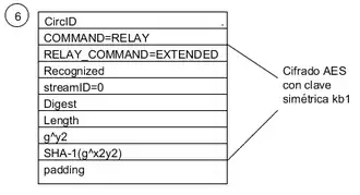 Observar que consiste en la comunicación de la respuesta al protocolo Diffie-Hellman que hace el OR2 al OP usando al OR1 como intermediario sin que este pueda inferir información alguna. El campo streamID vale 0 porque este tipo de células relay sirven para control.