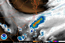 Más tarde, el 11 de mayo, la convección volvió a encenderse en el centro a medida que el sistema se desplazaba hacia el sursureste, aunque carecía de suficiente organización para calificar como un ciclón tropical.[14] El 12 de mayo la actividad de la lluvia se había organizado en gran medida al este del centro, y el Centro Nacional de Huracanes señaló que un pequeño aumento en la convección daría lugar a la formación de una depresión tropical.[15] Acelerado al este-northeastward fuera de los Estados Unidos continentales sin redeveloping, y después de pasar sobre aguas más frescas, los restos de Andrea fusionaron con un frente de río el 14 de mayo 14.[16][17]