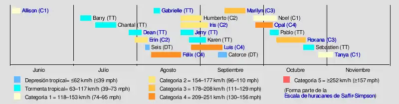 La ciclogénesis tropical en la temporada de huracanes del Atlántico comenzó con el desarrollo del huracán Allison el 2 de junio. El mes de julio fue muy activo, con la formación de cuatro ciclones tropicales. Este récord de tormentas en julio se mantuvo hasta la temporada de 2005, cuando se formaron cinco tormentas en julio. Un total de siete tormentas se formaron en agosto: Felix, Gabrielle, Humberto, Iris, Jerry, Karen y Luis, igualando el récord de la temporada de 1933 de mayor cantidad en el mes; este récord se rompió en la temporada de 2004, cuando se formaron ocho tormentas nombradas durante agosto. Aunque septiembre es el pico climatológico de la temporada de huracanes, fue mucho menos activo que agosto. Cuatro ciclones tropicales se desarrollaron en septiembre, con Marilyn, Noel y Opal finalmente fortaleciéndose hasta convertirse en huracanes. Cuatro ciclones tropicales también se formaron en octubre; notablemente, el huracán Roxana se desarrolló en ese mes. La última tormenta de la temporada, el huracán Tanya, se desarrolló más tarde en octubre y finalmente se convirtió en ciclón extratropical el 1 de noviembre. Esta fue la primera vez desde que los meteorólogos comenzaron a asignar nombres a las tormentas tropicales en 1953, que se utilizaron nombres que comenzaban con las letras «O» a «T».