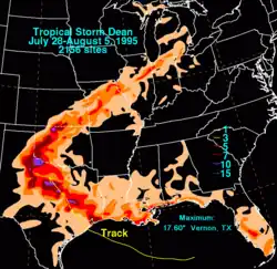 - ↑ a b c d David Roth (18 de enero de 2007). «Tropical Storm Dean - July 28-August 4, 1995». Hydrometeorological Prediction Center. Consultado el 11 de junio de 2025.