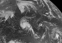 Imágenes de VISSR tomadas el 2 de septiembre de 1996 de Edouard (arriba; frente a la costa del noreste de los Estados Unidos), Fran (abajo a la izquierda; al norte de La Española), los restos de Gustav (a la derecha de Fran; en el Atlántico abierto) y el perturbación que se convertiría en Hortense (abajo a la derecha; en el MDR).