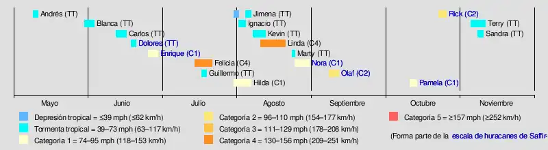 En junio, la tormenta tropical Dolores tocó tierra cerca de la frontera de los estados mexicanos de Colima y Michoacán, causando la muerte de tres personas y causando daños asegurados por valor de 50 millones de dólares. Apenas una semana después, el huracán Enrique pasó paralelo a la costa oeste de México, causando dos muertes adicionales y una cantidad similar de daños. En agosto, el huracán Nora tocó tierra en el estado de Jalisco y avanzó en paralelo a la costa del Pacífico de México hasta disiparse, lo que provocó daños estimados en 100 millones de dólares y tres muertes más. Menos de dos semanas después, el huracán Olaf tocó tierra en Baja California Sur como huracán de categoría 2. En octubre, el huracán Pamela azotó Nayarit con una intensidad de categoría 1, dejando cuatro personas desaparecidas y graves inundaciones. Más tarde ese mes, el huracán Rick azotó cerca de la frontera entre Michoacán y Guerrero en su máxima intensidad como un fuerte huracán de categoría 2.
