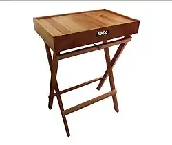 Es una mesilla portátil con cuatro patas plegables. Tiene doble cubierta y entre ambas, en su interior, varias corridas de tapas metálicas de bebidas. Las hay con una cubierta de lata y otra de tablitas sueltas, pero siempre con las tapitas. Se toca con los dedos, con dedales o simplemente con las manos. Otra variante es una caja que se coloca sobre las rodillas y, finalmente, una caja que se porta con una correa desde el cuello, que permite percutirla de pie.